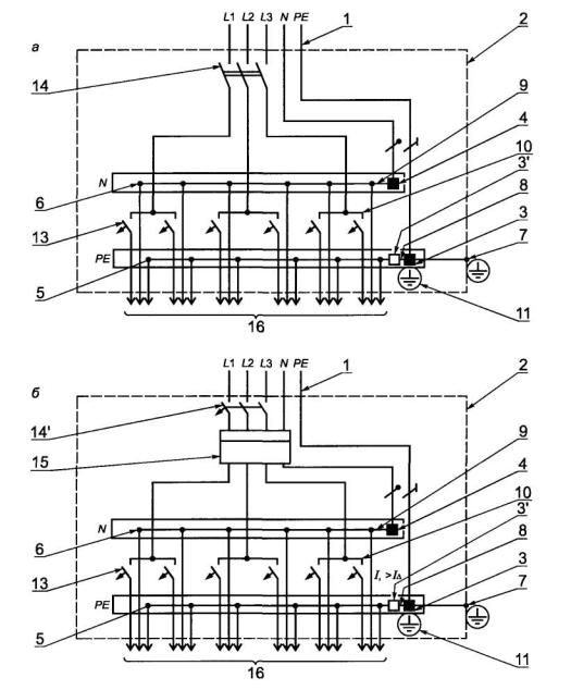 1 - питающая сеть; 2 - проводящая оболочка щитка; 3, 4 - зажимы проводников ввода (нулевого защитного РЕ и нулевого рабочего N); 3' - неиспользованный зажим (назначение согласно рисунку А.3); 5, 6 - зажимы для нулевого защитного РЕ и нулевого рабочего проводников групповой цепи; 7 - зажим для присоединения заземляющего проводника (см. рисунок А.5) или проводника уравнивания потенциалов; 8 - соединительный элемент зажимов нулевых защитных проводников РЕ (ввода, поз.3 и групповых цепей, поз. 5); 9 - соединительный элемент зажимов нулевых рабочих проводников N (ввода, поз. 4 и групповых цепей, поз. 6); 10 - соединительный элемент входных выводов защитных аппаратов групповых цепей; 11 - знак заземления у зажимов (поз. 3, 7); 12 - устройство защитного отключения (рисунок А.1б); 13 - автоматический выключатель; 14 - выключатель; 14' - автоматический выключатель; 15 - счетчик (рисунок А.1б); 16 - линии групповых цепей