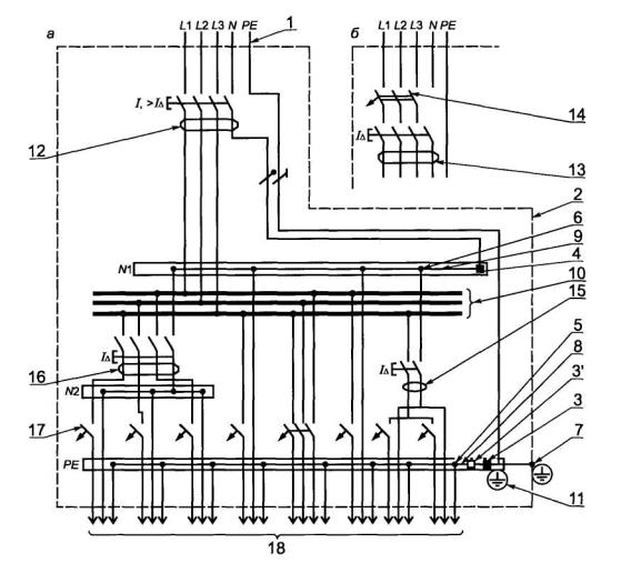 1 - питающая цепь; 2 - проводящая оболочка щитка; 3, 4 - зажимы проводников ввода (нулевого защитного РЕ и нулевого рабочего N); 3' - неиспользованный зажим (назначение согласно рисунку А.3); 5, 6 - зажимы для нулевого защитного РЕ и нулевого рабочего N проводников групповой цепи); 7 - зажим для присоединения заземляющего проводника (см. рисунок А.5) или проводника уравнивания потенциалов; 8 - соединительный элемент зажимов нулевых защитных проводников РЕ (ввода, поз. 3 и групповых цепей, поз. 5); 9 - соединительный элемент зажимов нулевых рабочих проводников N (ввода, поз. 4 и групповых цепей, поз. 6); 10 - соединительные элементы входных выводов защитных аппаратов групповых цепей или сборные шины; 11 - знак заземления у зажимов (поз. 3, 7); 12 - устройство защитного отключения на вводе щитка по варианту а); 13, 14 - устройство защитного отключения и выключатель на вводе щитка по варианту б); 15, 16 - устройства защитного отключения групповых цепей; 17 - автоматический выключатель; 18 - линии групповых цепей