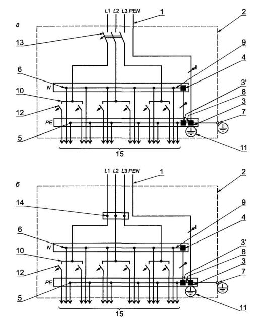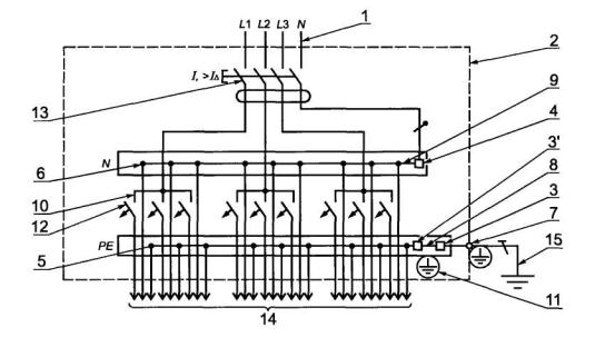 1 - питающая цепь; 2 - проводящая оболочка щитка; 3, 3' - неиспользованные зажимы (назначение согласно рисунку А.3); 4 - зажим для нулевого рабочего проводника ввода N; 5, 6 - зажимы защитного РЕ и нулевого рабочего N проводников групповой цепи; 7 - зажим для присоединения заземляющего проводника (поз. 10); 8 - соединительный элемент зажимов защитных проводников групповых цепей; 9 - соединительный элемент зажимов нулевых рабочих проводников N (ввода, поз. 4 и групповых цепей, поз. 6); 10 - соединительный элемент входных выводов защитных аппаратов групповых цепей; 11 - знак заземления у зажимов (поз. 3, 7); 12 - автоматический выключатель; 13 - устройство защитного отключения; 14 - линии групповых цепей; 15 - заземляющий проводник