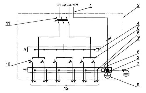 1 - питающая цепь; 2 - проводящая оболочка щитка; 3 - зажим для защитного проводника ввода (PEN-проводника); 3', 4 - неиспользованные зажимы (назначение согласно рисунку А.3); 5 - зажим с присоединенным PEN-проводником групповой цепи; 6 - соединительный элемент зажимов нулевых защитных проводников (поз. 3, 3', 5); 7 - зажим для присоединения заземляющего проводника (см. рисунок А.5) или проводника уравнивания потенциалов; 8 - соединительный элемент входных выводов защитных аппаратов групповых цепей; 9 - знак заземления у зажимов (поз. 3, 7); 10 - автоматический выключатель; 11 - выключатель; 12 - линии групповых цепей