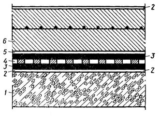 1 - бетон или выравнивающий слой из цементно-песчаного раствора; 2 - тиоколовая грунтовка; 3 - тиоколовый гидроизоляционный состав; 4 - стеклянная сетка тканая или нетканая; 5 - освежающая покраска тиоколовой грунтовкой (по п. 2.7); 6 - защитный слой, армированный металлической сеткой