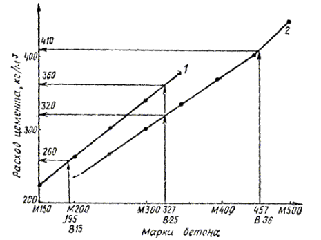 График зависимости расхода цемента марки 400 (1) и марки 500 (2) от марки бетона