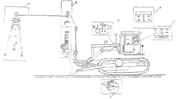 1 - лазерный излучатель; 2 - электрогидрораспределитель; 3 - пульт управления бульдозером; 4 - блок управления подъемным устройством; 5 - фотоэлектрический приемник; 6 - подъемное устройство; 7 - угловой датчик автономной системы управления положением отвала