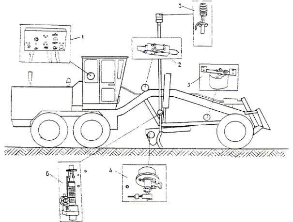 1 - пульт управления системой автоматики «Профиль-20»; 2 - электрогидрораспределитель ЗСУ-8; 3 - автономный датчик контроля углового положения отвала ДКБ; 4 - щуповой датчик управления отвалом по высоте, работающий по копиру ДЩБ; 5 - фотоэлектрический приемник; 6 - подъемное устройство
