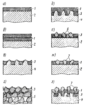 а, б - одно- и двухслойные замыкающие слои (износа); в - заполняющий слой (износа); г - закупорочный слой; д - з - комбинированные слои;