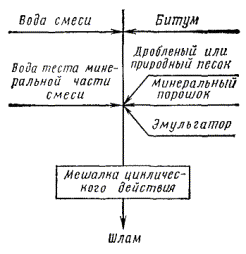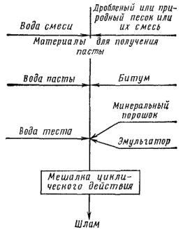 1.1.7. По технологии приготовления различают смеси, получаемые одностадийным и двустадийным способом. По одностадийному способу получают пастовые шламы путем интенсивного принудительного перемешивания одновременно всех компонентов смеси, включая битум, в мешалках циклического действия со скоростью вращения лопастей более 60 об/мин, минуя стадию приготовления пасты.