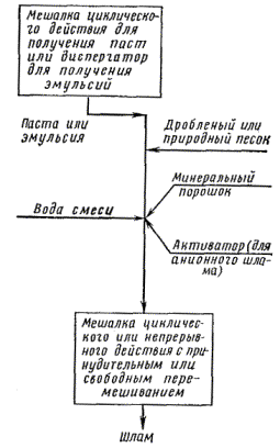 При двустадийном совмещенном способе пасту и шлам готовят последовательно в одной и той же мешалке. При двустадийном раздельном способе пасту и шлам готовят в разных мешалках или в одной и той же мешалке, но с перегрузкой пасты в промежуточную емкость. Анионные шламы готовят по двустадийному раздельному способу. Вначале готовят эмульсию на специальных базах или в специальных цехах, а затем - шлам по двустадийному способу.