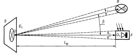 В - проекторный (прожекторный) источник света типа В по ГОСТ 7721; S - исследуемая секция светофора; F - фотометрическая головка гониометра; ОО1 - ось фотометрирования; ОО2 - оптическая ось источника света типа В; b - угол освещения; g - апертура излучающей поверхности источника типа В, g = 0,5° - 1,5 °; g - апертура входной диафрагмы фотометрической головки, не более 10’; Lф - расстояние фотометрирования, обеспечивающее выполнение закона «обратных квадратов»