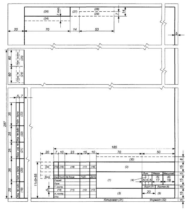 Таблица изменений в основной надписи при необходимости может продолжаться вверх или влево от основной надписи (при наличии графы 33 - влево от нее).