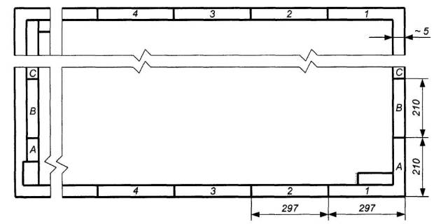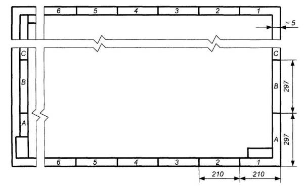5.4 Для быстрого нахождения на чертеже (схеме) составной части изделия или его элемента рекомендуется разбивать поле чертежа (схемы) на зоны. Отметки, разделяющие чертеж (схему) на зоны, рекомендуется наносить на расстоянии, равном одной из сторон формата А4 (рисунки Б.1 и Б.2 приложения Б).