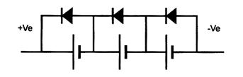 - использованием шунтирующих диодов, подсоединенных так, чтобы ограничить переполюсовки напряжения по каждому элементу (например защитные меры для батареи, состоящей из трех последовательно соединенных элементов (схема приведена на рисунке Е.1).