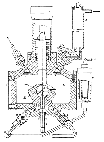 а - внутренняя камера; b - внешняя цилиндрическая оболочка; с - микрометрический винт; d - выходное отверстие; е - огнепреградители; f - смотровые окна; g - входные вентили; h - искровой электрод; i - выходное отверстие; k - нижняя регулируемая поверхность зазора; l - верхняя регулируемая поверхность зазора