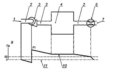 Р1 - давление защитного газа (определяется по сопротивлению потока через газопровод, части внутри оболочки и в ряде случаев - через дроссельную заслонку); 1 - вход защитного газа (в безопасной зоне); 2-газопровод; 3 - вентилятор; 4- оболочка; 5 - дроссельная заслонка (в том случае, когда требуется поддерживать избыточное давление); 6 - (не используется на этом рисунке); 7-выход защитного газа; 8- (не используется на этом рисунке); 9-избыточное давление, Па; 10 - внутреннее давление; 11 - наружное давление