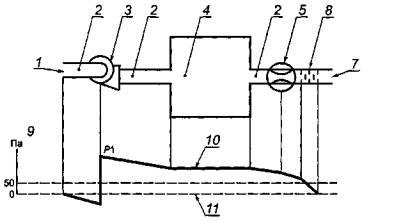Р1 - давление защитного газа (определяется по сопротивлению потока через газопровод, части внутри оболочки и в ряде случаев - через дроссельную заслонку и защитный барьер от искр и частиц); 1 - вход защитного газа (в безопасной зоне); 2- газопровод; 3 - вентилятор; 4 - оболочка; 5 - дроссельная заслонка (в том случае, когда требуется поддерживать избыточное давление); 6 - (не используется на этом рисунке); 7 - выход защитного газа; 8 - защитный барьер от искр и частиц; 9 - избыточное давление, Па; 10 - внутреннее давление; 11 - наружное давление