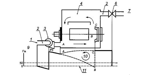 Р3 – давление защитного газа (определяется по сопротивлению внутренних частей потоку и подтверждается по воздействию внутреннего вентилятора, используемого для охлаждения, на участках А, В и С); 1 - вход защитного газа (в безопасной зоне); 2 - газопровод; 3 - вентилятор; 4 - оболочка; 5 - (не используется на этом рисунке); 6 - выходной клапан; 7 - выход защитного газа; 8 - (не используется на этом рисунке); 9 - избыточное давление, Па; 10 - внутреннее давление; 11 - внешнее давление