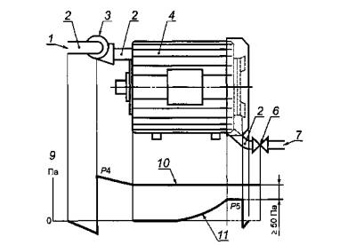 Р4 - давление защитного газа (определяется по сопротивлению внутренних частей потоку и по наибольшему значению давления наружного воздуха); Р5 - давление наружного воздуха, создаваемое наружным охлаждающим вентилятором; 1 - вход защитного газа; 2 - газопровод; 3 - вентилятор; 4 - оболочка; 5 - (не используется на этом рисунке); 6 - выходной клапан; 7 - выход защитного газа; 8 - (не используется на этом рисунке); 9 - избыточное давление, Па; 10-внутреннее давление; 11 - внешнее давление