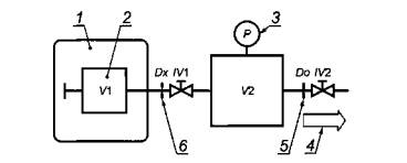 1 - система, заполненная гелием; 2 - испытуемая система; 3 - устройство контроля давления; 4 - система отвода газа; 5 - критический диаметр отверстия; 6 - диаметр соединительного сопла