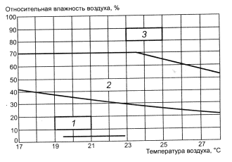 8.4. Измеряют температуру и относительную влажность окружающего воздуха на расстоянии от 0,1 до 0,25 м от емкости с образцом для испытания. Если полученные значения не отвечают требованиям, приведенным на рисунке 2, перед началом испытания принимают меры для изменения относительной влажности. Регистрируют температуру и относительную влажность воздуха.