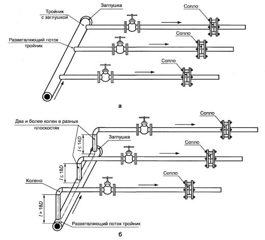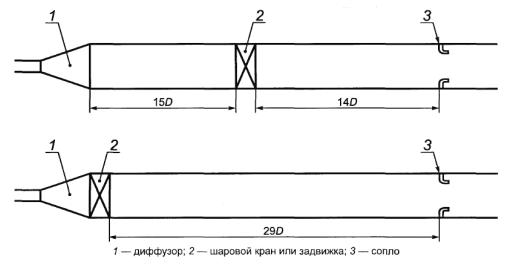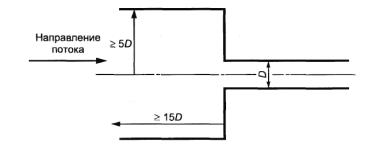 В соответствии с таблицей 5 и требованиями 6.2.8, после вентиля необходим участок длиной 16 D, а после конфузора - 1 D. Если длины прямолинейных участков перед тройником сокращены в обоих направлениях или только в одном направлении, к неопределенности коэффициента истечения арифметически добавляют дополнительную неопределенность, равную 0,5 %.