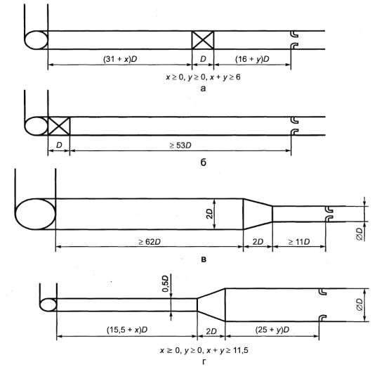 Если перед СУ установлено МС вида «Смешивающий потоки тройник», то соответствие требованиям к длинам прямолинейных участков ИТ необходимо проверять по всем звеньям труб, образующим это местное сопротивление, например по схеме, представленной на рисунке А.7.