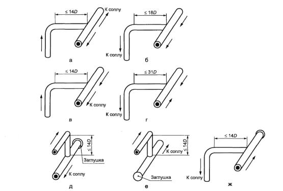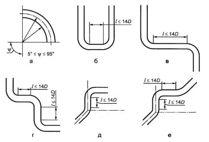 А.1.2 «Два или более колен в одной плоскости» - два или более колен, оси которых лежат в одной плоскости (см рисунки А.1 б, в, г), расположенные один за другим на расстоянии l ≤ 14 D.