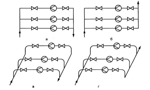 А.5.2 Коллекторные схемы подразделяют на П - и Z - образные. В П - образной системе (см. рисунки А.4 а, в) потоки в коллекторах имеют противоположные направления, а в Z - образной системе (см. рисунки А.4 б, г) - одинаковые направления.