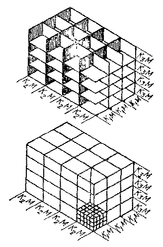 1.1. Модульная координация размеров в строительстве (МКРС) должна осуществляться на базе модульной пространственной координационной системы и предусматривать предпочтительное применение прямоугольной модульной пространственной координационной системы (черт. 1).