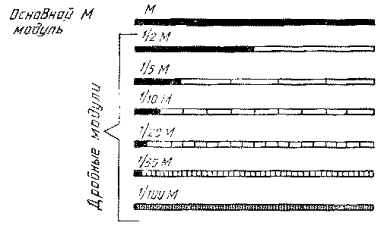 2.2. Для назначения координационных размеров объемно-планировочных и конструктивных элементов, строительных изделий, оборудования, а также для построения систематических рядов однородных координационных размеров должны применяться наряду с основным следующие производные модули (черт. 2):