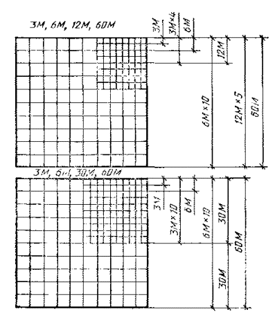 2.4. Укрупненные модули для размеров в плане каждого конкретного вида зданий, его планировочных и конструктивных элементов, проемов и т.д. должны составлять группу, выбранную из общего ряда, установленного п. 2.2, таким образом, чтобы каждый относительно больший модуль был кратен всем меньшим, чем достигается совместимость членений модульных сеток (черт. 3).