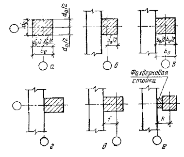 4.6. Внутренняя координационная плоскость наружных самонесущих и навесных стен должна совмещаться с координационной осью (черт. 9д) или смещаться на размер е с учетом привязки несущих конструкций в плане и особенности примыкания стен к вертикальным несущим конструкциям или перекрытиям (черт. 9е).