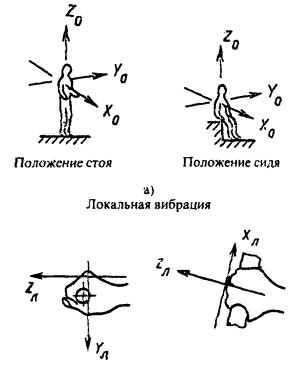 · общую вибрацию подразделяют на действующую вдоль осей ортогональной системы координат Xо, Yо, Zo, где Хо (от спины к груди) и Yo (от правого плеча к левому) - горизонтальные оси, направленные параллельно опорным поверхностям; Zo - вертикальная ось, перпендикулярная опорным поверхностям тела в местах его контакта с сиденьем, полом и т.п.