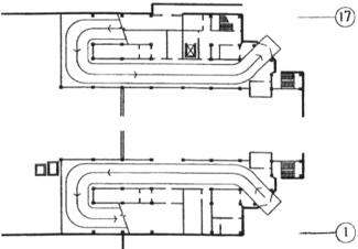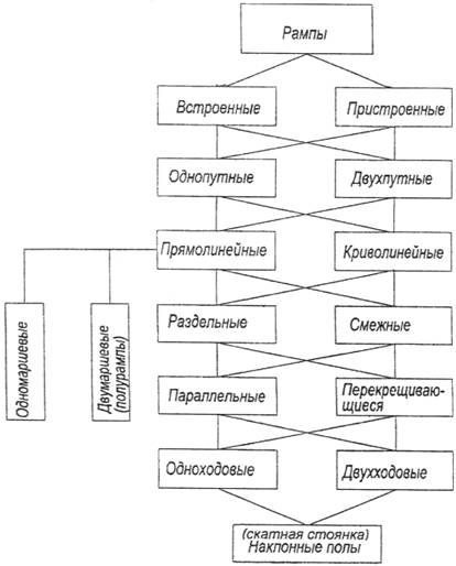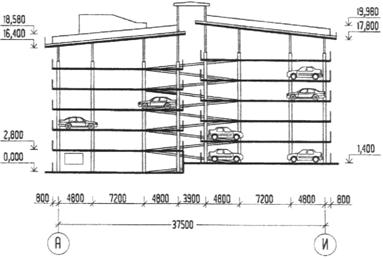 Перемещение автомобилей осуществляется по двум изолированным рампам криволинейного очертания с полуэтажа на полуэтаж.
