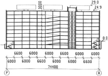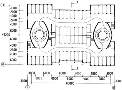 Конструктивное решение - каркас из сборных железобетонных элементов «КПНС» - безригельной конструктивной системы с преднапряжением диска перекрытий в построечных условиях (модификация югославской конструктивной системы «ИМС»). Покрытие - из оцинкованных профилированных листов по стальным прогонам и балкам, покрываемым специальным огнезащитным составом.