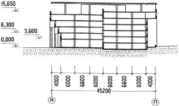 Конструкции - монолитный железобетонный каркас с сечением колонн 400´400 мм, ребристые перекрытия с приведенной толщиной 200 мм, навес на покрытии из профнастила по металлическому каркасу, наружные стены навесные из монолитного керамзитобетона толщиной 380 мм.