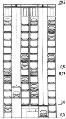 Автостоянка предусматривается для временного размещения автомобилей и состоит из двух модулей по 25 машино-мест. В каждом модуле по 12 ярусов высотой по 1,85 м. Подъемник-мунипулятор обеспечивает подъем и установку автомобиля в соответствующую ячейку и управляется автоматизированной системой с микропроцессором, может также работать от внешнего компьютера и индивидуальной карточки абонента. Среднее время установки и выдачи машины по данным проектной организации составляет - 47 сек.