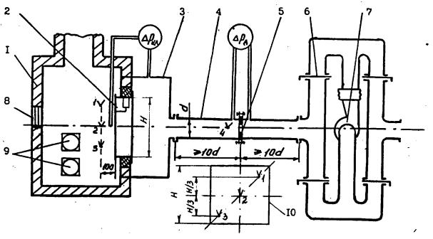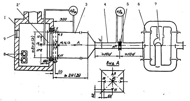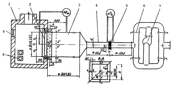 1 - печь; 2 - клапан; 3 - воздуховод; 4 - мерный участок воздуховода; 5 - сегментная диафрагма; 6 - регулирующая заслонка; 7 - вентилятор; 8 - форсунки; 9 - иллюминатор;