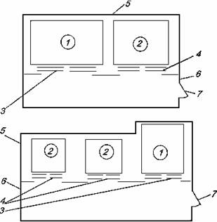 1 – лифт для пожарных; 2 – пассажирские лифты; 3 – противопожарная дверь шахты лифта для пожарных с пределом огнестойкости EI 60; 4 – противопожарная дверь шахты пассажирских лифтов с пределом огнестойкости EI 60; 5 – ограждающие конструкции общей шахты с пределом огнестойкости REI 120; 6 – противопожарные перегородки 1-го типа, ограждающие лифтовый холл (тамбур); 7 – противопожарная дверь 2-го типа лифтового холла (тамбура) в дымогазонепроницаемом исполнении
