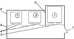 1 – лифт для пожарных; 2 – пассажирские лифты; 3 – противопожарная дверь шахты лифта для пожарных с пределом огнестойкости EI 60; 4 – противопожарная дверь шахты пассажирских лифтов с пределом огнестойкости E 30; 5 – ограждающие конструкции шахты лифта для пожарных с пределом огнестойкости REI 120; 6 – противопожарные перегородки 1-го типа, ограждающие лифтовый холл; 7 – противопожарная дверь 2-го типа лифтового холла в дымогазонепроницаемом исполнении; 8 – ограждающие конструкции шахты пассажирских лифтов с пределами огнестойкости, установленными соответствующими СНиП