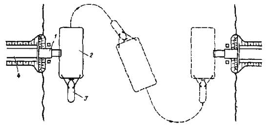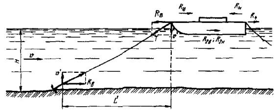 Предпочтение следует отдавать способу перемещения парома по тросу буксирным катером, расположенным под бортом парома снизу по течению (см. рис. 2, в).