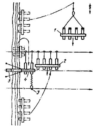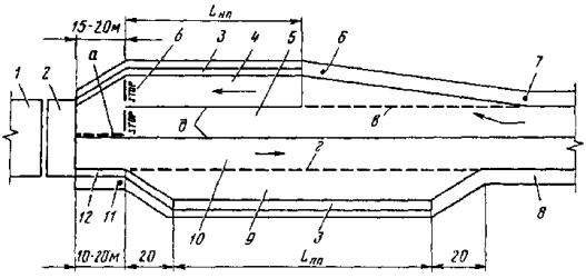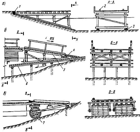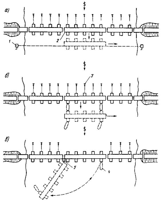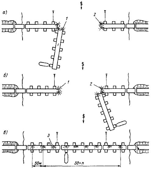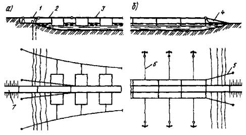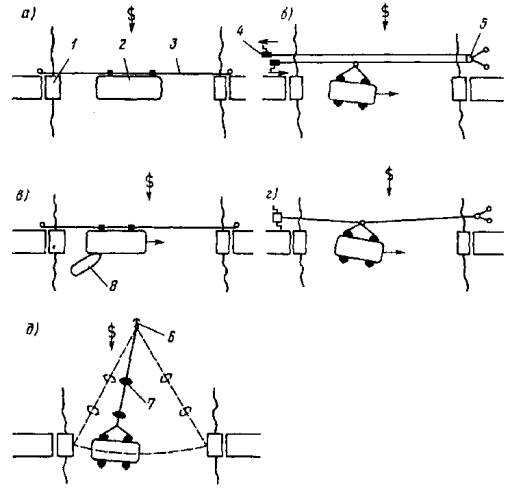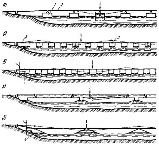 2.2. Возможно применение различных схем организации паромных переправ. На канатных переправах (рис. 2) движение парома осуществляется по тросу, натянутому поперек реки. Перемещение парома по тросу может осуществляться вручную (рис. 2, а), с помощью лебедок при фиксированном прикреплении парома к тросу (рис. 2, б), буксировкой катером под бортом (рис. 2, в), с использованием силы течения реки (паром-самолет) (рис. 2, г). Возможно применение парома-самолета при продольном расположении троса (рис. 2, д), низовой конец которого закреплен на пароме, а верховой - на якоре на расстоянии 1,5-2 ширины реки вверх по течению. На бесканатных переправах используются самоходные или несамоходные буксируемые (толкаемые) паромы. Схемы движения самоходных и несамоходных буксируемых паромов зависят от способа погрузки-выгрузки автомобилей (рис. 3, 4) и местных условий.