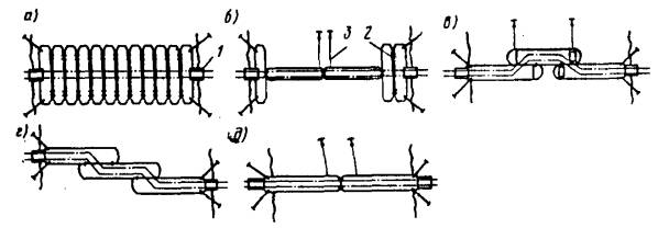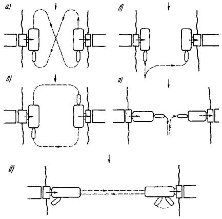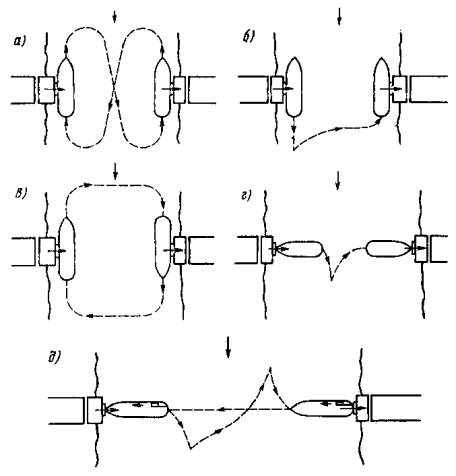 а - "восьмеркой" с погрузкой-выгрузкой через оба борта; б - "семеркой" с погрузкой-выгрузкой через оба борта; в - по кругу с погрузкой-выгрузкой через один борт; г - "семеркой" с погрузкой-выгрузкой через носовую оконечность парома; д - по прямой с продольной погрузкой-выгрузкой через обе оконечности парома и расположением буксира под бортом