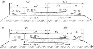 1.8. Гравийные покрытия устраивают серповидного (рис. 1.1, а) или полукорытного (рис. 1.1, б) профиля. Полукорытный профиль применяют в хорошо дренирующих грунтах или при устройстве дополнительных слоев из дренирующих грунтов (с коэффициентом фильтрации не менее 1 м/сут) на всю ширину земляного полотна.