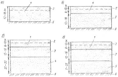 а - однослойным; б - двухслойным; в - двухслойным на дополнительном песчаном слое; г - трехслойным; 1 - песчано-гравийно-щебеночная смесь