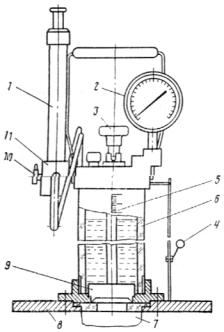 В рабочий цилиндр вверх дном погружен мерный цилиндр 2, закрепленный на штативе 1. Мерный цилиндр выполняет роль Мариоттовского сосуда и установлен так, что его открытый край находится на расстоянии 17 см от дна рабочего цилиндра. Под воронкой расположен стакан 6 для сбора и учета фильтрата. Для приготовления (уплотнения) образца в состав прибора входит направляющий стержень с цилиндрической гирей массой 0,5 кг.