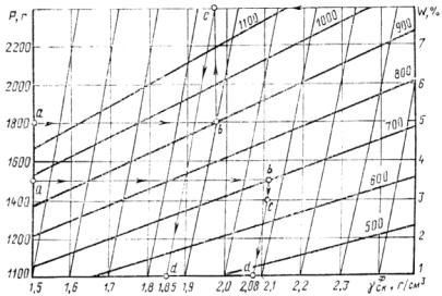 Потребный расход ЛСТ и воды для получения необходимого количества раствора с заданным содержанием сухих веществ определяют по номограмме, представленной на рис. 2. Например, для приготовления 1 м3 раствора с 30 %-ным содержанием сухих веществ из ЛСТ с 50 %-ным содержанием сухого вещества требуется 0,55 м3 ЛСТ и 0,45 м3 воды.