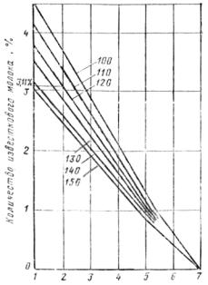 Количество известкового молока, необходимого для нейтрализации сульфитною щелока, зависит от его концентрации и рН щелока и определяется в процентах к весу щелока по номограмме, представленной на рисунке. Например, для нейтрализации сульфитного щелока, имеющего рН-2, требуется 3,1 % известкового молока концентрацией 120 г/л от веса сульфитного щелока.