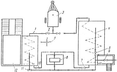 Установка для приготовления растворов (рис. 1) состоит из: смесителя 1 -цистерны объемом 10 м3; насосной установки 8; склада готовой продукции 4 -цистерны объемом 50-100м3; парообразователя 3; эстакады 12 и системы трубопроводов. Смеситель и цистерна для хранения должны быть, оборудованы паровой системой для разогрева растворов до температуры 60-80°С.