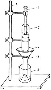 Описание прибора. Прибор представляет собой рабочий цилиндр 3 (см. рис. 1) из оргстекла с внутренним диаметром 5 см и высотой 20 см. Цилиндр имеет сетчатое дно (dотв = 0,25 мм), которое закрыт кружком фильтровальной бумаги. На наружной стороне рабочего цилиндра от нижнего его конца сделана градуировка через 5 мм на всю высоту цилиндра. Рабочий цилиндр закреплен на штативе 1 и установлен на металлической сетке 4 (d = 12 см, dотв = 2 мм), расположенной сверху воронки 5, которая также закреплена на штативе.