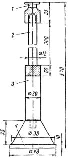 Проведение испытаний. Воздушно-сухой песок в количестве 600 г помещают в алюминиевую миску. К нему добавляют 2 % воды и тщательно перемешивают в течение 1-2мни до получения однородной смеси. В увлажненный песок вводят ЛСТ в количестве 6 % (в пересчете на 50 % содержание сухих веществ от массы сухого песка) и снова тщательно перемешивают в течение 5 мин до получения однородной смеси. Полученную смесь в количестве 500 г загружают в рабочий цилиндр 3 с сетчатым дном, покрытым кружком фильтровальной бумаги. Смесь загружают в три слоя с уплотнением каждого 25 ударами цилиндрической гири массой 0,5 кг, падающей по направляющему стержню с высоты 300 мм (см. рис. 2). Общее количество ударов 75. Высота столба должна быть около 15 см.