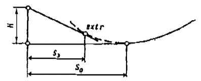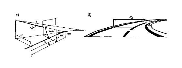 3.2.2. Зрительную плавность дороги следует оценивать расчетами на ЭВМ; используя специальные программы. При их отсутствии такие расчеты могут быть выполнены и вручную. Для этого последовательно определяют расстояние до экстремальной точки на кривой, высоту глаз водителя над поверхностью кривой, видимый радиус, кривизны ведущей линии Rα, видимую ширину проезжей части Вα.